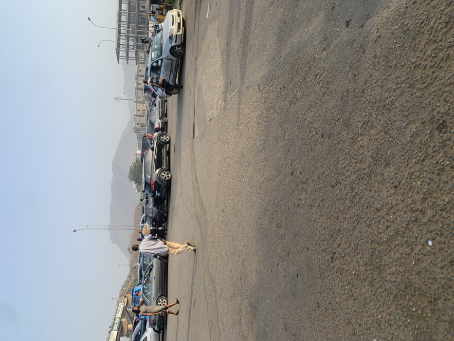 A line of parked cars sits beside a wide asphalt road under a light blue sky. Several people stand or walk near the cars. In the background, buildings and a mountainous landscape are visible. Light poles punctuate the space between the road and the buildings. The asphalt surface has varied textures and slight changes in color.