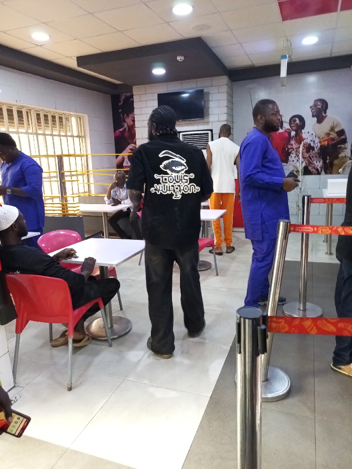 scene inside a restaurant in Karonmajigi, Nigeria. Five men are present. One is seated at a table with a white top, wearing a black shirt and black pants. Another is seated at a table with a white top and is wearing a dark shirt. A third man is standing near the entrance, wearing a black shirt with a white eye design, and the words "LOUIS VUITTON" printed on the back. A fourth man is standing, wearing an orange tank top and orange pants. A fifth man is standing, wearing a blue shirt, and dark pants. There is a white wall with a large mural featuring people dressed in colorful clothing. There are four white tables with red chairs. Two stainless steel stanchions, connected by a red rope, are seen in the foreground. There is a red chair on the left side of the image, near a white table. The restaurant is lit by fluorescent lights, with white tiled flooring.
