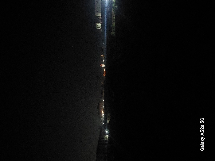A dimly lit nighttime view reveals a distant cityscape. Pinpoints of light stretch across the horizon, suggesting buildings and roads. The darkness dominates the scene, obscuring details of the foreground. A slight, faint vertical streak of light appears further out, possibly a street lamp or floodlight. The overall impression is one of stillness and quiet. "Galaxy A52s 5G" text is visible in the lower right corner of the image.