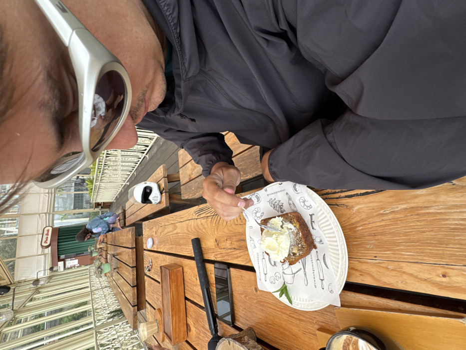 An overhead shot shows a person at a wooden table, wearing sunglasses and a grey jacket. They are eating a slice of banana bread topped with cream. A white plate with a patterned paper doily holds the treat. A black golf club leans against the table next to a cell phone. In the background, there is a glass enclosure with other tables and people. A white motorcycle helmet sits on the table, a few seats down.