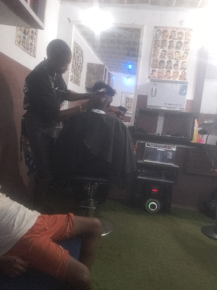 In a barber shop, a barber in a black shirt gives a haircut to a client seated in a black cape. The shop is furnished with mirrors, posters of hairstyles, and an entertainment center including a speaker. Another person, wearing a white shirt and orange shorts, is seen partially in the foreground. The green carpet provides a distinct contrast to the other colors present.