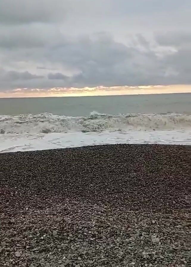 pebble beach on a cloudy day. The waves are crashing onto the shore. The sky is overcast with a hint of light on the horizon. There are no people visible in the video.