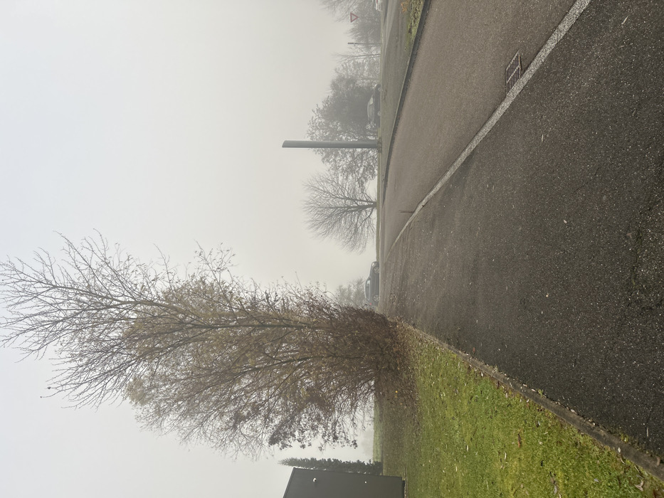 A misty, overcast day reveals a scene of a road bordered by grass and trees. Bare trees stretch out in the foreground and distance, obscured by the fog. Cars parked alongside the road fade into the haze. A light post is visible in the middle ground. The pavement is wet and reflects the muted light. A white line marks the edge of the road. A dark, indistinct structure peeks out from beneath the trees.