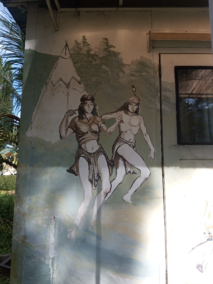 A faded mural graces the side of a building, depicting a Native American man and woman in traditional attire
