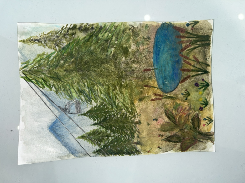 - "The image depicts a watercolor or crayon drawing on paper, presenting a mountainous forest landscape located in Vladaya, Bulgaria" by FM-7mR1N2, licensed under CC BY 4.0