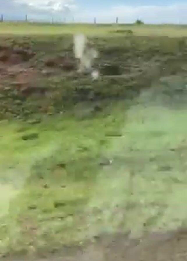 The video depicts a landscape of green grass and dirt hills under a partly cloudy sky, viewed from a moving vehicle through a slightly dirty window