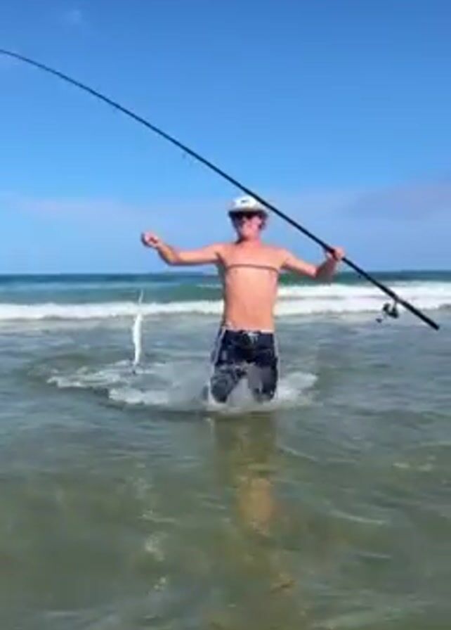 A shirtless young man in a white cap and dark swim trunks stands waist-deep in ocean water and holds up a fish he caught on a fishing rod, which he is also holding. He celebrates and yells joyfully. The sky is clear and blue. There is sand and some trees in the background on the shore. Small waves are visible in the ocean.