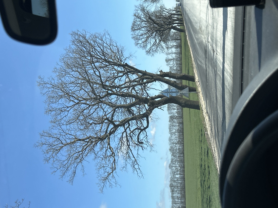 The image depicts a rural road in the vicinity of Senokos, Bulgaria, viewed from the interior of a vehicle. The foreground features the top segment of a dark-colored steering wheel on the lower left and the bottom edge of a rearview mirror on the upper right. The scene is dominated by a clear, light blue sky with minimal cloud cover. To the right of the asphalt road, a line of large, bare deciduous trees with dark, gnarled branches extends into the distance. A cluster of these trees, with multiple trunks, stands prominently in the midground directly adjacent to the road. Attached to a pole near these trees are two inverted triangular traffic signs, white with red borders, stacked vertically, typically indicating "give way" or "yield." To the left of the road, a vast, flat field of vibrant green crops stretches to the horizon. A distant line of uniformly sized bare deciduous trees forms the far horizon line above this field. The two-lane road, showing areas of lighter-colored surface residue, curves gently to the right as it recedes. In the far distance along the road, two faint vehicles are visible. The overall environment suggests a late winter or early spring setting due to the leafless trees and green ground cover. No individuals are visible.