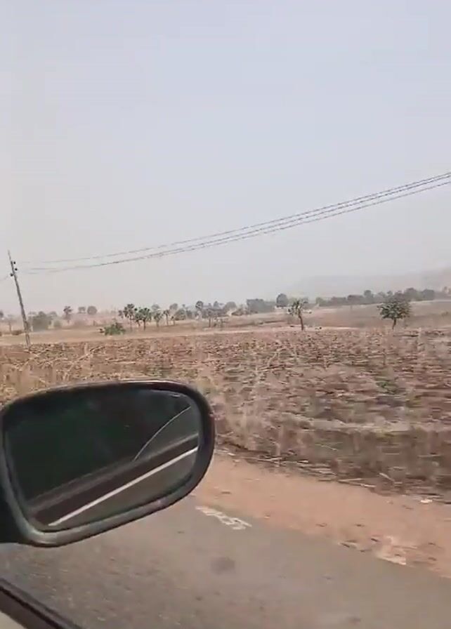 view from a car driving on an asphalt road. The side mirror of the car is visible in the foreground. The scenery outside the window includes a field of dry, brown vegetation, with scattered palm trees. Power lines run parallel to the road. In the distance, there is a slightly elevated landmass. The sky is overcast.