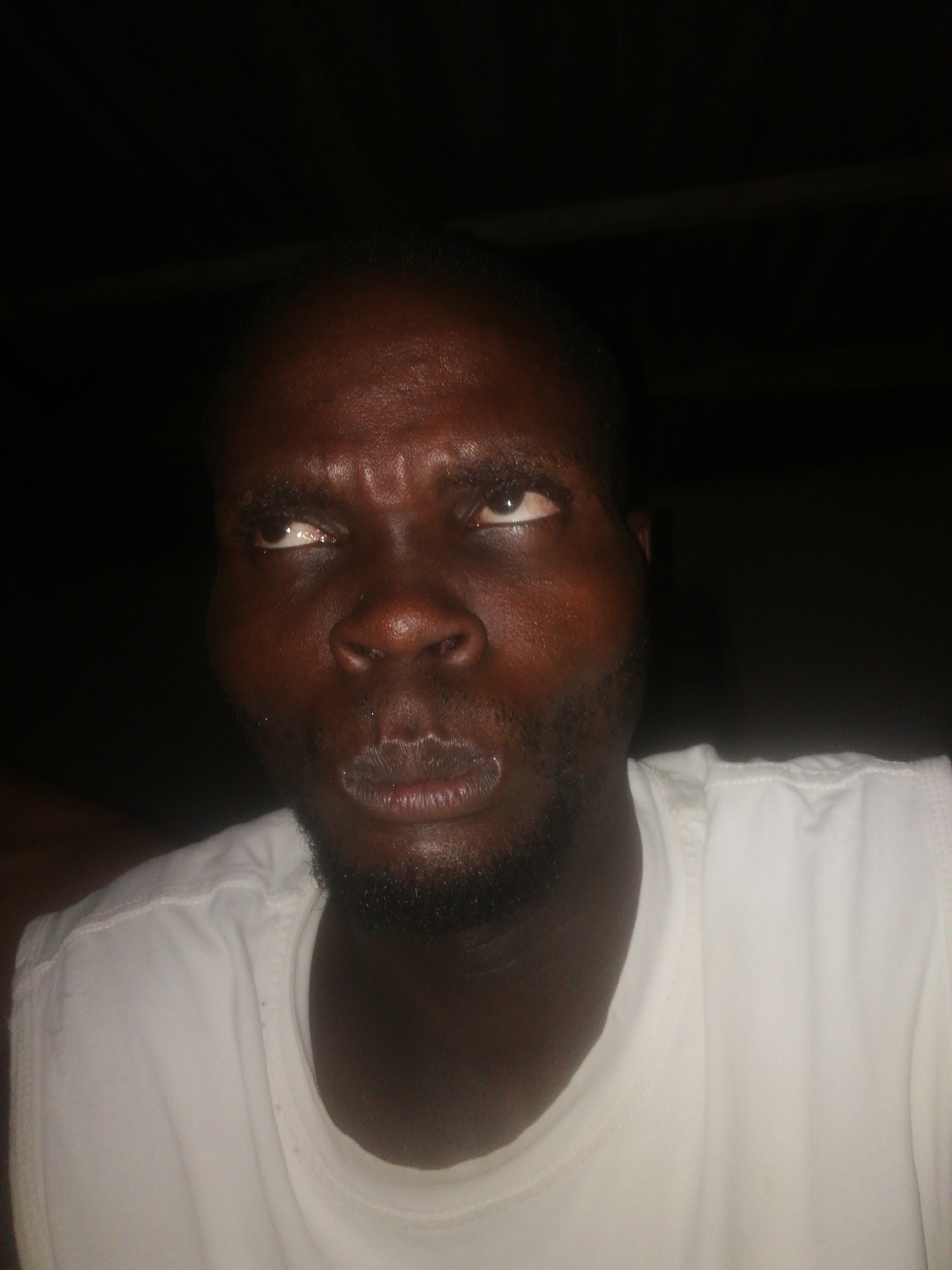 A medium close-up shot depicts a dark-skinned man with a shaved head and a short beard. He is wearing a white t-shirt. His eyes are rolled upwards and to the left, with a slight pout to his lips. The background is dark. The location is unknown; Ikorodu, Nigeria, cannot be confirmed.