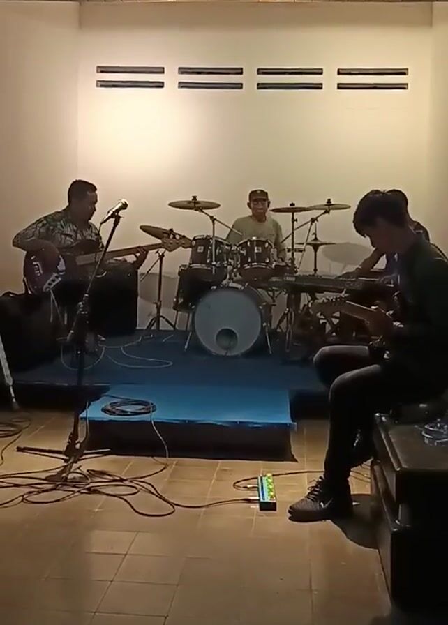 band of four people playing music in a small, cozy room. One man is seated on a wooden bench in the right side foreground, playing an electric guitar. Another man is seated playing a bass guitar. A drummer is positioned in the center of the room behind his drum kit, and another person is standing playing the keyboard. The band is set up on a low stage covered in blue padding. Overhead, track lighting illuminates the band. The walls of the room are white, with several horizontal rectangular openings near the top. Cables snake across the tile floor in front of the stage. A microphone stands in front of the bass guitar player. The overall lighting is dim and warm, giving the room a relaxed and intimate feel.