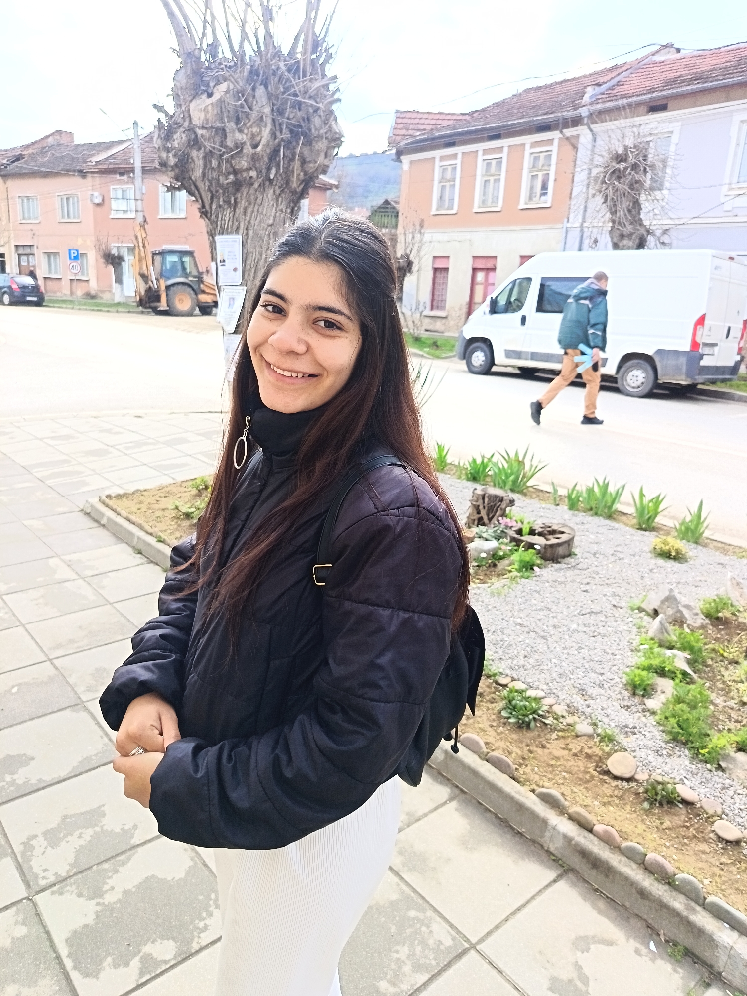 The image depicts a street scene in the city of Roman, Bulgaria, under an overcast sky. In the immediate foreground, a young adult female with long, dark hair and a smiling expression faces the viewer. She wears a black collared quilted jacket, white ribbed trousers, a black backpack, a silver hoop earring on her left ear, and a ring with a clear stone on her left ring finger. She stands on a grey tiled sidewalk. In the midground to the left, a large, bare, gnarled tree stands in front of a peach-colored, two-story building with a red-tiled roof. A black sedan and a yellow backhoe loader are parked on the adjacent street, near road signs for parking and a 40 km/h speed limit. To the right, a gravel planter with small green plants and decorative rocks is situated alongside the sidewalk. On the street, a white commercial van is parked. A male subject, wearing a green jacket and tan pants, walks from right to left past the van, carrying a light blue object in his left hand. A light-colored, two-story building with a red-tiled roof is visible behind the van. Distant hills form the background.