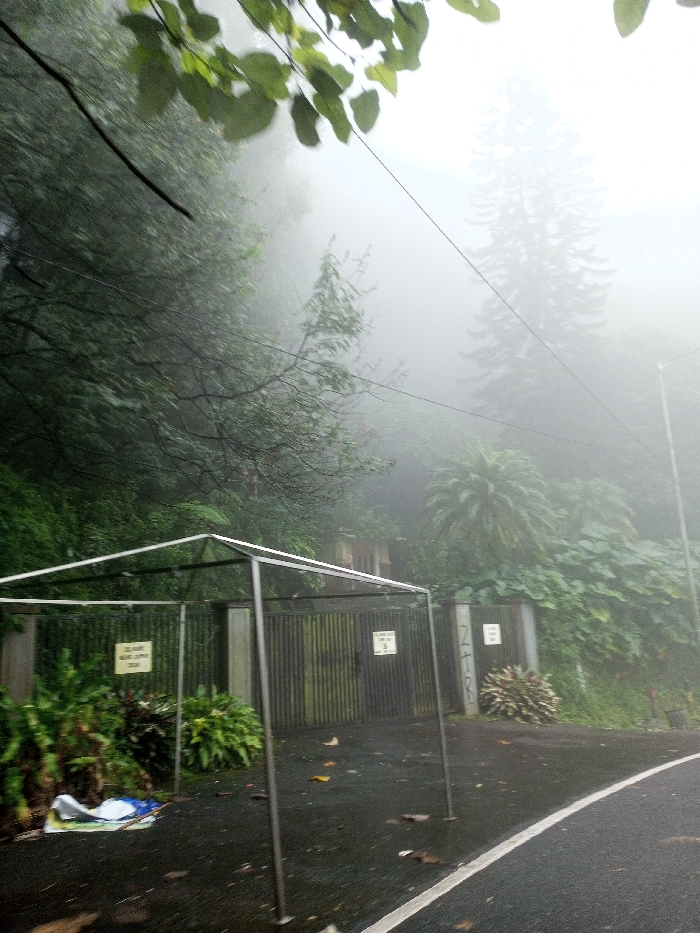 The scene depicts a foggy outdoor environment in what is stated to be Neerveli, Sri Lanka. A two-lane asphalt road with a white demarcation line curves into the foreground from the lower right. Centrally positioned in the mid-ground is a bare, metallic frame structure, possibly for a canopy or tent, with four vertical posts and a rectangular top frame. Behind this structure, a dark, vertical-slatted metal fence or gate extends across the width of the frame. Attached to the left section of the fence is a rectangular yellow sign with dark text, and a number "3" is discernible. To the right of the gate, a white sign with dark text and a number "5" is visible. Dense green foliage, including bushes and larger trees, lines the entire left side and background of the image, extending behind the fence. A distinctive palm-like plant is prominent to the right of the gate. Heavy fog obscures the background, rendering distant trees, including a tall coniferous-like tree on the upper right, as faint silhouettes. A utility pole or street light post is partially visible on the far right. Overhead, wires run diagonally across the frame, partially obscured by tree branches with green leaves in the upper left corner. No individuals or active interactions are present. The ground appears wet, with scattered fallen leaves.
