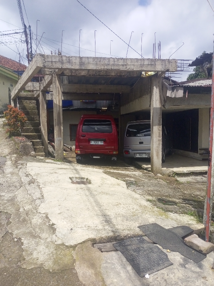 The scene depicts a static outdoor environment in Ciherang, Indonesia, under a partly cloudy sky. The foreground features an uneven concrete paved area, with patches of dirt and moss, and two dark-colored rubber floor mats lying on the right. In the midground, an unfinished concrete structure serves as a carport or ground-level open space, supported by concrete pillars. An external concrete staircase ascends along the left side of this structure. Rebar protrudes vertically from the concrete roof slab, indicating incomplete construction for an upper level. Parked beneath this structure are two small vans, both seen from the rear. The left vehicle is a red Suzuki Carry 1.0, bearing Indonesian license plate "F 3369 CK", with chevron-patterned mudflaps. To its right is a silver-gray van, also appearing to be a Suzuki model, with Indonesian license plate "B 8049 EM". Behind the vehicles, a building with a light-colored wall and a window is partially visible. To the far left, a portion of another building with a reddish-brown tiled roof is discernible. On the far right, part of a building with a corrugated metal roof, exhibiting some damage or wear, is visible. Overhead, multiple utility lines are strung across the frame. A small, reddish-orange leafy plant grows beside the staircase on the left. No individuals are present in the image.