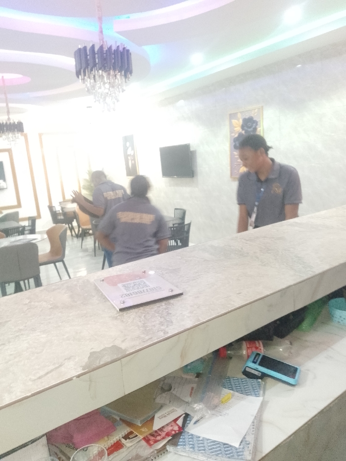 A restaurant interior features tables and chairs, two chandeliers, and a flat screen television mounted on the wall. Three people wearing uniforms are visible. One is standing behind a counter, while the other two are walking in the background. The counter has a sign with a QR code and some clutter underneath it, including papers and a small electronic device. The ceiling has a multi-tiered circular design with colored lighting.