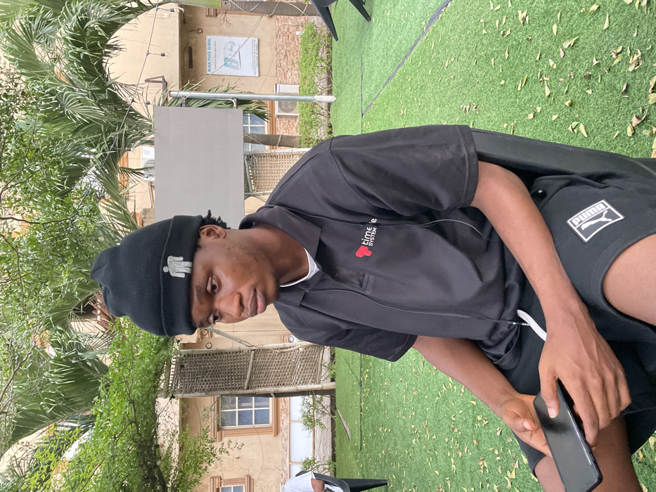 An outdoor scene in Alagba, Nigeria, depicts a young adult male seated in a black chair, positioned on green artificial turf scattered with brown leaves