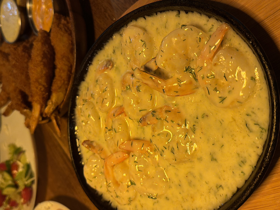 A cast iron skillet holds creamy, dill-infused shrimp. The pale yellow sauce coats plump shrimp, some exhibiting orange tails. Adjacent, crispy, breaded shrimp skewers are served with dipping sauces. A side salad with lettuce and red berries is visible. The dishes are arranged on a wooden surface, under warm lighting, suggesting a restaurant setting.