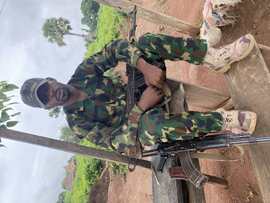 An adult male is seated outdoors on a crudely constructed wooden bench or platform. He is wearing a green, brown, and black camouflage uniform, including a long-sleeved shirt, trousers, and a baseball cap. His feet are clad in light-colored, possibly camouflage-patterned, tactical boots. He possesses a dark complexion and a short, dark beard, and is looking directly at the camera with a neutral expression. One AK-pattern rifle, dark in color with a magazine inserted, rests horizontally across his lap, with his hands clasped over it. A second, similar AK-pattern rifle, also dark with a magazine, leans vertically against the wooden structure to the subject's left. The ground is composed of reddish-brown soil. In the background, green vegetation covers gently rolling terrain, with several thatched-roof huts visible on a distant hillside to the left. A tall, slender palm tree stands prominently in the right background against an overcast, light grey sky. The scene is consistent with a rural or semi-rural setting in Zaki Biam, Nigeria.