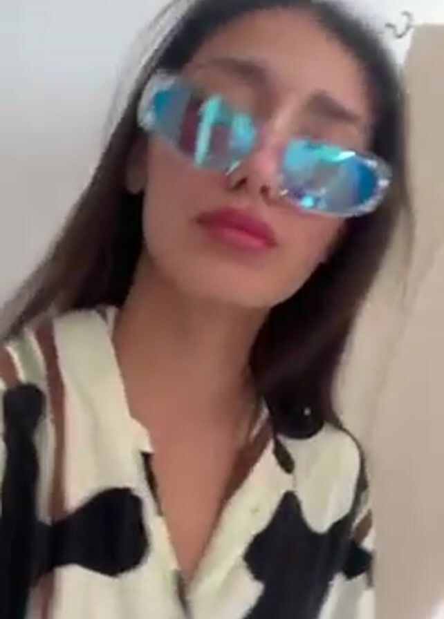 A woman with long, dark hair and pink lips wearing clear-framed sunglasses with blue, reflective lenses is looking at the camera. She is wearing a button-up shirt with a black and beige pattern. The background is a plain white wall. The camera angle is low, looking up at the woman, and she rotates her head slightly, showcasing the sunglasses.