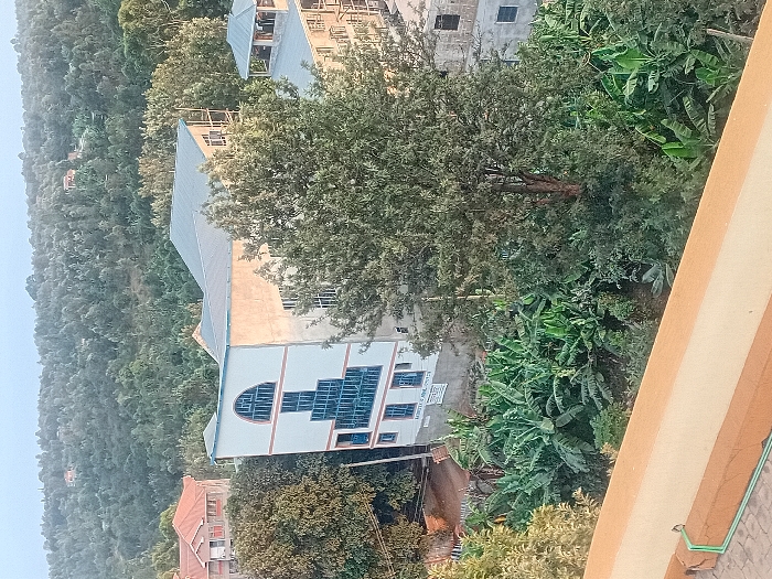 The image presents an elevated view of an urban or semi-urban landscape in Karingani ward, Kenya. A multi-story building with a light-colored facade dominates the midground, distinguished by a large arched window structure at its upper level and multiple vertical rectangular windows below, framed in a dark color. A sign on the building's lower section displays partially legible text, including the word "CENTER". To the left of this structure, a red-roofed building is visible. To the right and slightly behind, another multi-story building, appearing to be under construction, features exposed structural elements and a light-colored metal roof. The immediate foreground below the primary buildings is densely covered with large-leafed vegetation, primarily banana plants, interspersed with other trees and shrubs. A tall, leafy tree with a visible trunk stands prominently to the right of the central building. In the background, rolling hills densely covered with green forest extend into the distance, with several scattered small, red-roofed buildings visible on their slopes. The sky is light and appears overcast or hazy. No human activity or individuals are present. A low, light-tan concrete wall with a green utility pipe running along its top edge occupies the bottom portion of the frame.