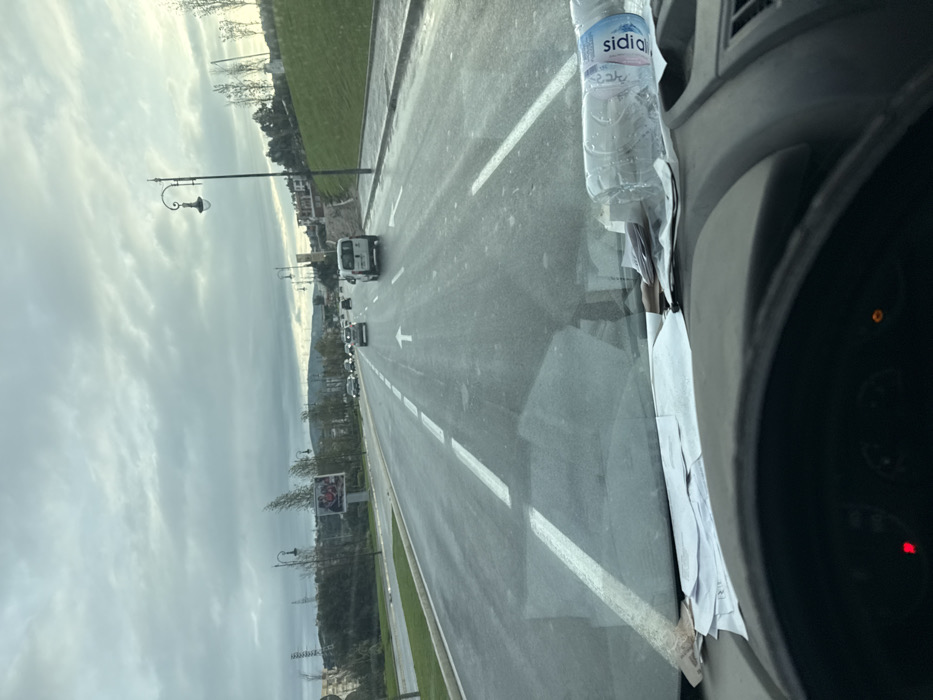 The image presents a view from inside a vehicle looking out onto a wet, multi-lane road in Al Bahraoyine, Morocco, under an overcast sky. The time of day is indeterminate but characterized by uniform grey clouds. In the immediate foreground, the top rim of a steering wheel is visible at the bottom of the frame, partially obscuring the dashboard which displays an illuminated red indicator light on the left and an amber indicator light on the right. A clear plastic water bottle, labeled "SIDIAL," rests horizontally on the dashboard near the center-right. Beneath and around the bottle are multiple white papers and a small, dark, unidentifiable object. The windshield appears streaked or dirty. The road ahead is asphalt, visibly wet, suggesting recent or ongoing rain. It features white dashed lane markings and two distinct white arrows painted on the surface: one pointing straight ahead in the current lane, and another indicating a right turn in an adjacent lane. Multiple vehicles, including passenger cars and a white utility van, are traveling in the same direction, receding into the distance. To the left of the road, a narrow green median separates traffic. Beyond this median, a large billboard displays an advertisement. Further left, the landscape consists of a green hillside with sparse trees and what appear to be electrical transmission towers in the distance. Residential buildings are discernible on the elevated terrain. To the right of the road, a well-maintained green grassy embankment rises steeply. Ornate black streetlights with curved arms are regularly spaced along both sides of the roadway. Further down the road on the right, an area of cleared earth with some construction debris is visible, indicating ongoing development. The distant horizon is characterized by hills. No human figures are explicitly visible.