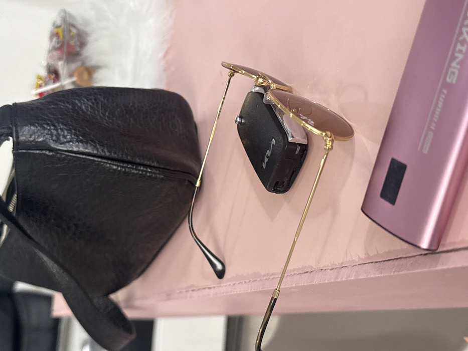 A black baseball cap sits next to gold-rimmed sunglasses with brown lenses. The sunglasses are perched on a shelf, holding a black car key fob. A pink portable charger labeled "KING" is partially visible on the right, also on the shelf. A blurry, white and colorful object sits behind the hat. The shelf has a pink, slightly worn surface.