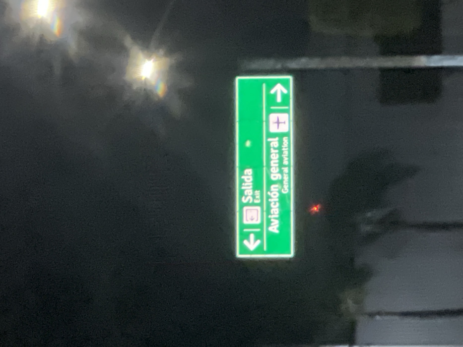A green sign at night reads "Salida" and "Exit" with a downward-pointing arrow, indicating the way out. Above, it directs towards "Aviación general" or "General Aviation" with an upward-pointing arrow and an airplane icon. The background is dark, possibly a dimly lit area near an airport or a road. There are blurry lights on the left side of the image, presumably light sources.