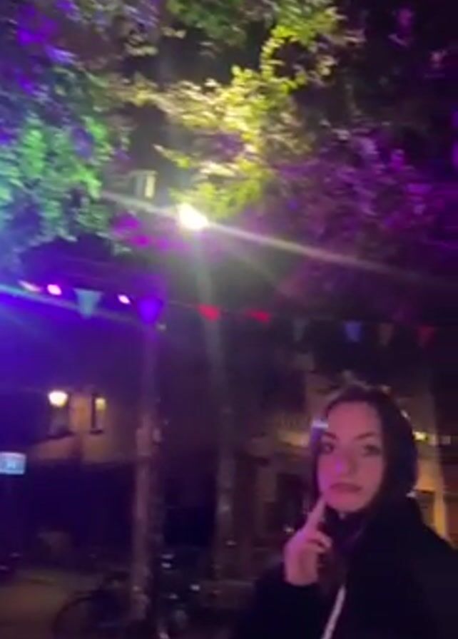 n outdoor night scene. A young woman with long brown hair stands in the foreground, wearing a dark jacket. Behind her are several bicycles parked on racks. In the background, there's a two-story building with lit windows. The area is lit by colorful spotlights, mainly purple, green, and yellow, shining into the trees above. A metal frame structure with triangle-shaped flags strung across is also visible. The scene appears to be set up for an event or celebration. The woman is stationary and looks to the side.