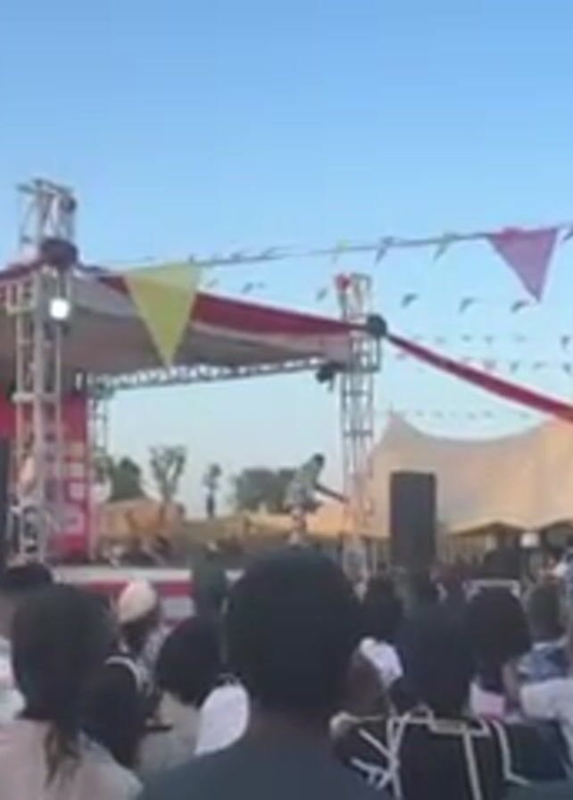 A large crowd of people stands facing a stage at an outdoor event under a clear sky. The stage is decorated with red and yellow fabric, and there is a white tent behind it. A man is standing on the stage, possibly performing or speaking. Multicolored flags are strung above the crowd. The people are diverse, and some are wearing traditional clothing. The video seems to be taken from the perspective of someone in the crowd.