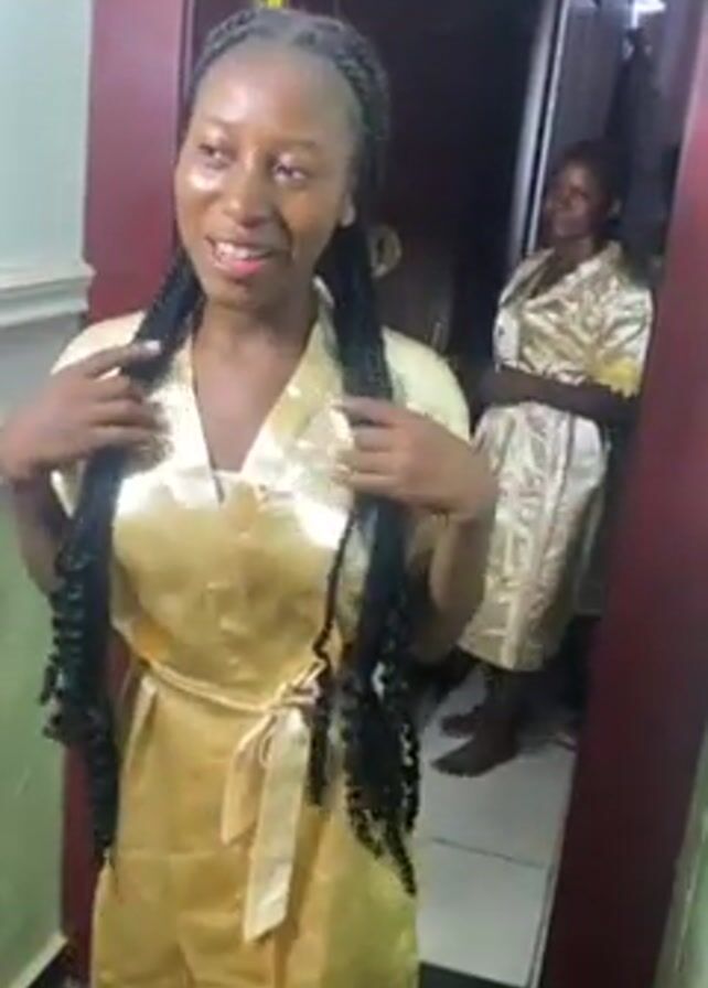 A young woman with long braids is standing in a doorway, smiling and gesturing outward with her hands. She is wearing a gold satin robe with a tie around her waist. The doorway is framed by reddish-brown wood trim. Behind her, partially visible through the doorway, is a woman also wearing a gold satin robe, smiling. The floor is white tile. The door has a design carved into it and a number "1" visible. The first woman moves slightly as the camera is repositioned.