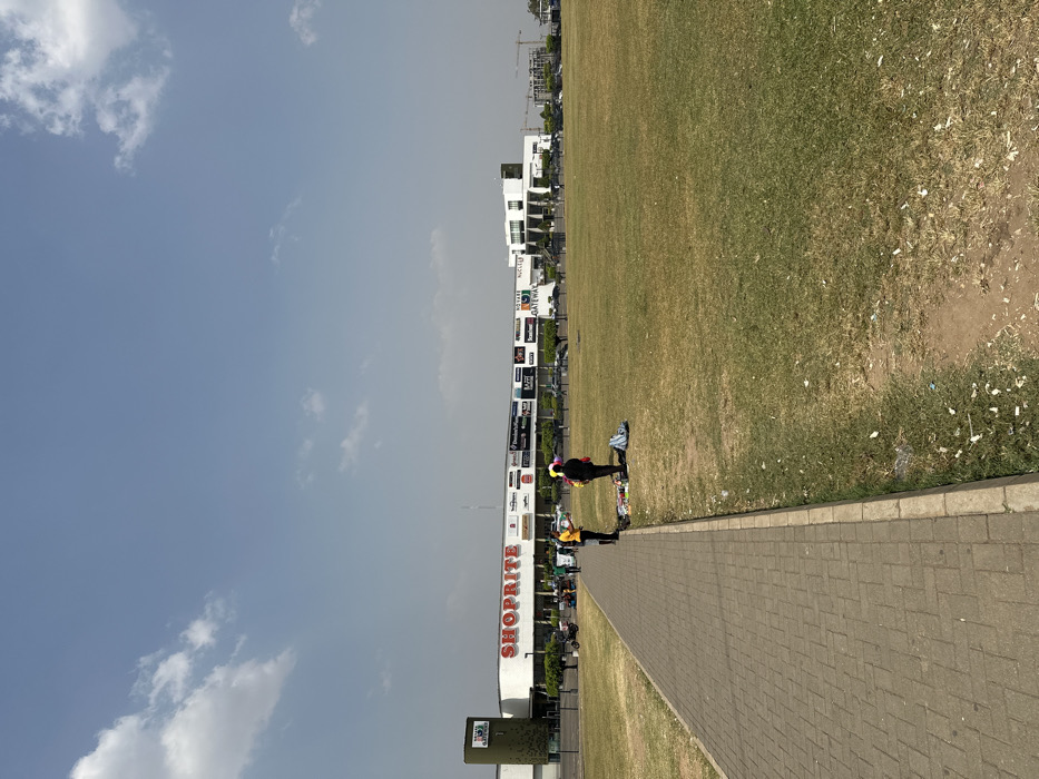 The image captures an exterior view of the Novare Gateway Mall, located in Lugbe, Abuja, Nigeria. The foreground is dominated by a wide, paved pedestrian pathway of light-colored interlocking blocks, extending from the lower-left towards the center-midground. Adjacent to the pathway on the right is an expansive area of mowed, dry grass with sparse green patches and visible litter. Two individuals are positioned on the grassy area near the pathway. One person, wearing a yellow shirt and dark trousers, stands facing right. The second person, dressed in dark attire, holds a collection of multicolored balloons and stands next to small items spread on a light-colored ground cover, likely merchandise, with a blue bag nearby. In the midground, a long, single-story commercial building, identified by prominent "SHOPRITE" and "Novare GATEWAY" signage, forms the main structure. Other visible store names include "Dominos Pizza," "Cold Stone Creamery," and "Bazi." A parking lot with several vehicles is situated directly in front of the building. To the far left of the building, a tall, cylindrical green structure bearing the "Novare Gateway" logo is present. The background features a clear, light blue sky with scattered white cumulus clouds. Distant elements include a communication tower behind the main building and several construction cranes visible on the far right horizon, indicating ongoing development. The scene is illuminated by bright daylight.
