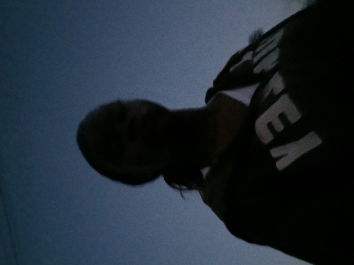 A low-angle shot shows a person silhouetted against a twilight or dark sky. The person wears a dark garment with large, white lettering, possibly spelling "HEY" vertically. The head is a dark shape on the left side of the frame. The sky is a gradient of blue and gray, darkening toward the top. The overall image is dark and lacks detail.