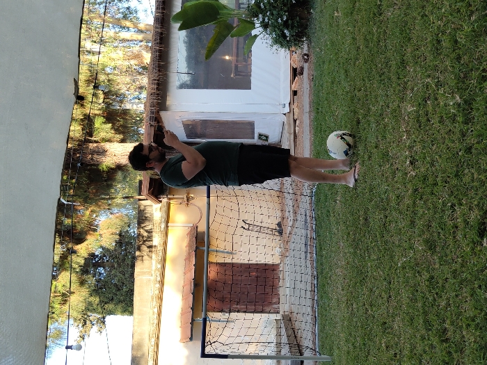 This image presents an outdoor residential scene located in Mate Asher Regional Council, Israel. A male subject, appearing to be in his 30s to 40s, with short dark hair, a beard, and eyeglasses, stands on a green lawn in the midground. He is dressed in a dark green t-shirt and dark shorts, with his right foot bare and a dark flip-flop on his left foot. The subject is observed holding a small, dark rectangular object, consistent with a smartphone, to his face. A white and black soccer ball rests on the grass near his feet. To the subject's left, a black soccer goal net with white poles is erected. The background features a light-colored building with sections of reddish-brown roof tiles and a white-framed structure resembling an enclosed patio or sunroom, adorned with a thatched fringe. Further left in the background, a dark brown door on another structure and a ladder leaning against a wall are visible. Tall evergreen trees are present in the distant background, under a clear sky. A white fabric shade canopy, strung with lights, extends across the upper portion of the frame.