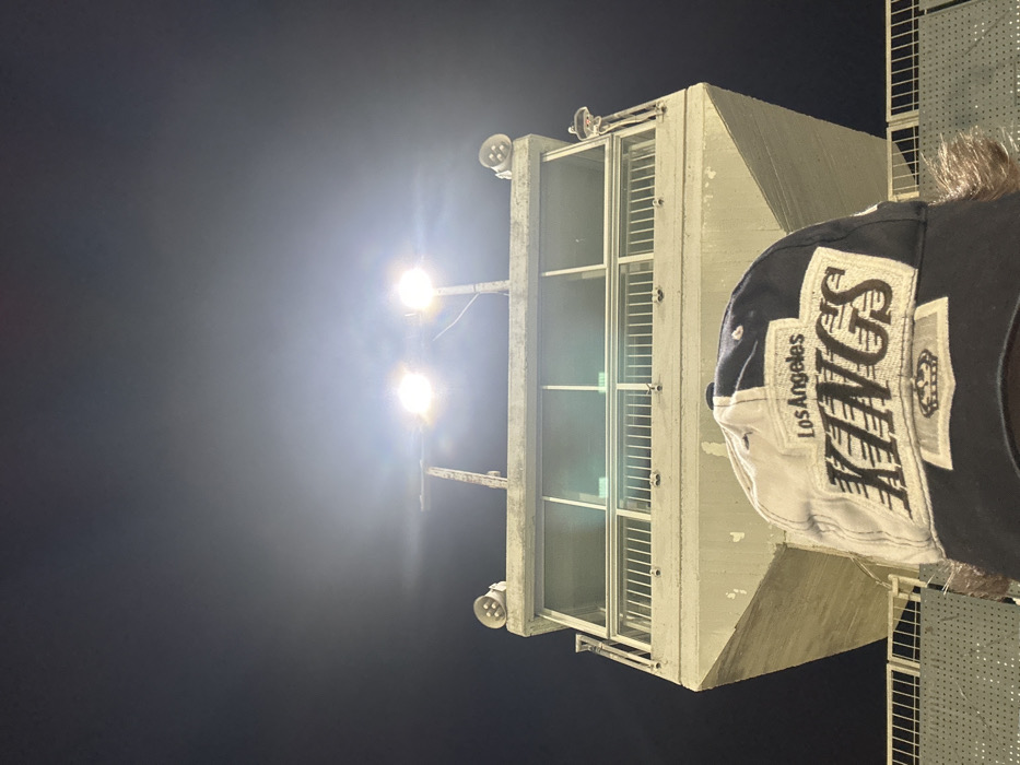 A low-angle, upward shot captures a tall, concrete structure featuring two stories, each with barred windows. Bright stadium lights shine above, casting a glare. A baseball cap with "Los Angeles KINGS" prominently displayed obscures part of the view, suggesting the photographer's perspective. The night sky is dark, providing contrast to the brightly lit structure and hat. A section of metal fencing is on the far right edge.