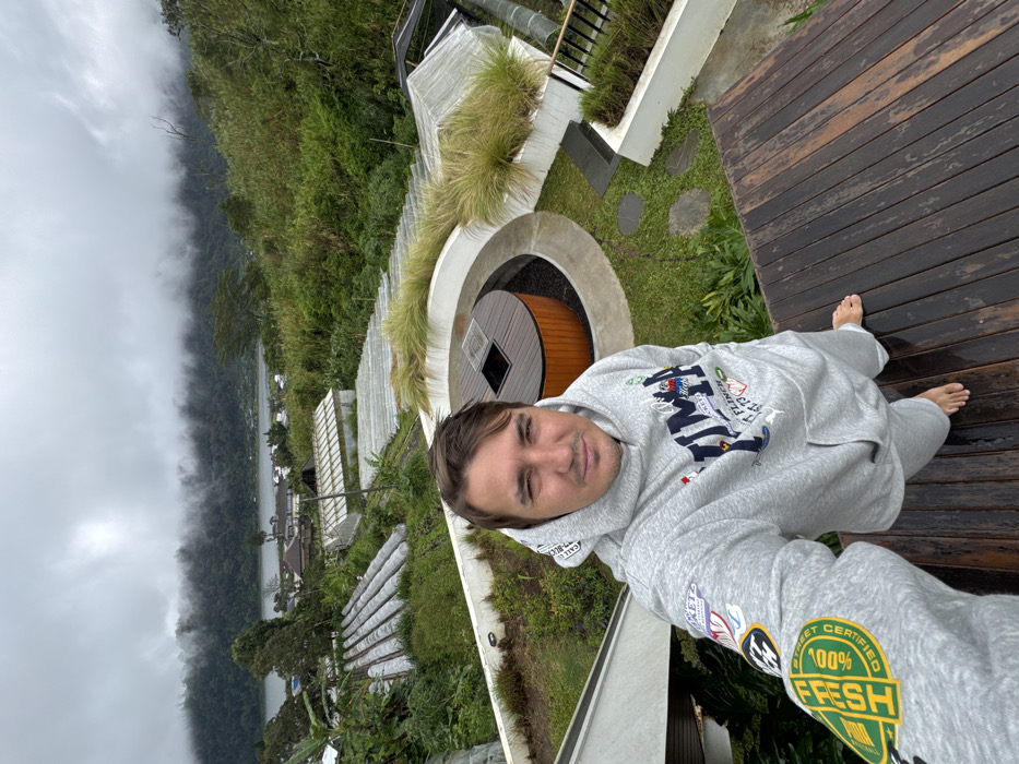 - "A man in a gray hoodie and sweatpants stands barefoot on a wooden deck, seemingly on a balcony overlooking a lush, green landscape" by FM-7OTCf2, licensed under CC BY 4.0