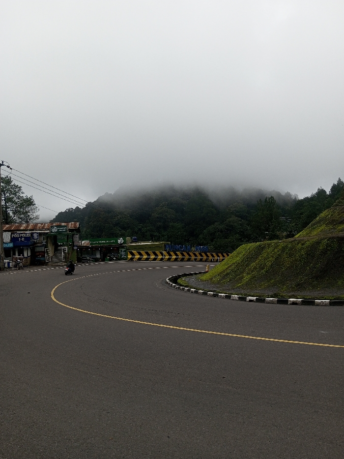 This image displays a curving asphalt road in the city of Deothang, Bhutan, under an overcast sky with mountainous terrain partially obscured by fog