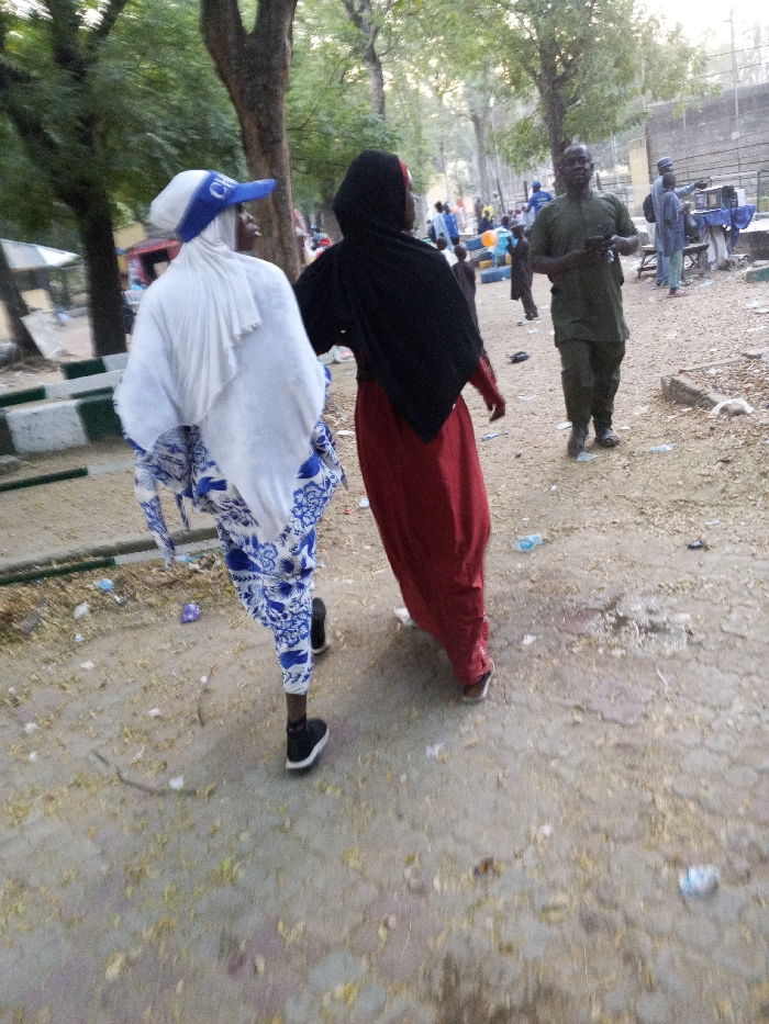 A medium shot shows two women walking away from the camera. The woman on the left wears a white head covering, a blue cap, and blue patterned pants with black shoes. The woman on the right wears a black head covering and a long red dress. In the background, a man in a green uniform is walking in the same direction as the two women, holding a phone. There are other people in the background, as well as trees and a dirt ground with some trash.