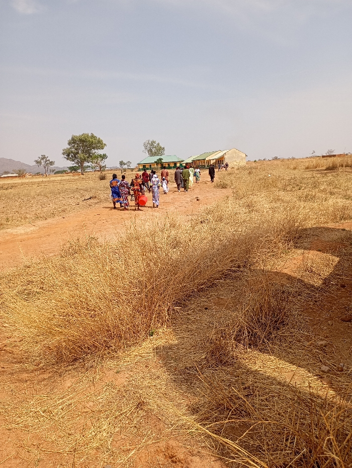 The image depicts an outdoor scene in Pankshin, Nigeria, under a clear, pale blue sky. The foreground and midground are characterized by reddish-brown soil extensively covered with dry, yellowed grass and sparse, bushy vegetation. A prominent dirt path traverses the scene from the lower center, leading towards the background. Approximately 15-20 individuals are visible walking in a staggered procession along this path, heading towards a cluster of buildings in the distant midground. The individuals are adults, dressed in various colorful, patterned traditional African attire. One individual in the leading portion of the group carries a large, reddish-orange cylindrical object, resembling a drum, on their right hip. In the background, a series of at least four single-story buildings are visible. These structures feature light-colored walls and have either light green or pale yellow roofs. To the left of these buildings, a single large tree with green foliage stands prominently. Beyond the buildings and the immediate landscape, a range of hazy, distant hills or mountains is discernible against the horizon. The overall environment suggests a dry season in a rural or semi-rural setting.