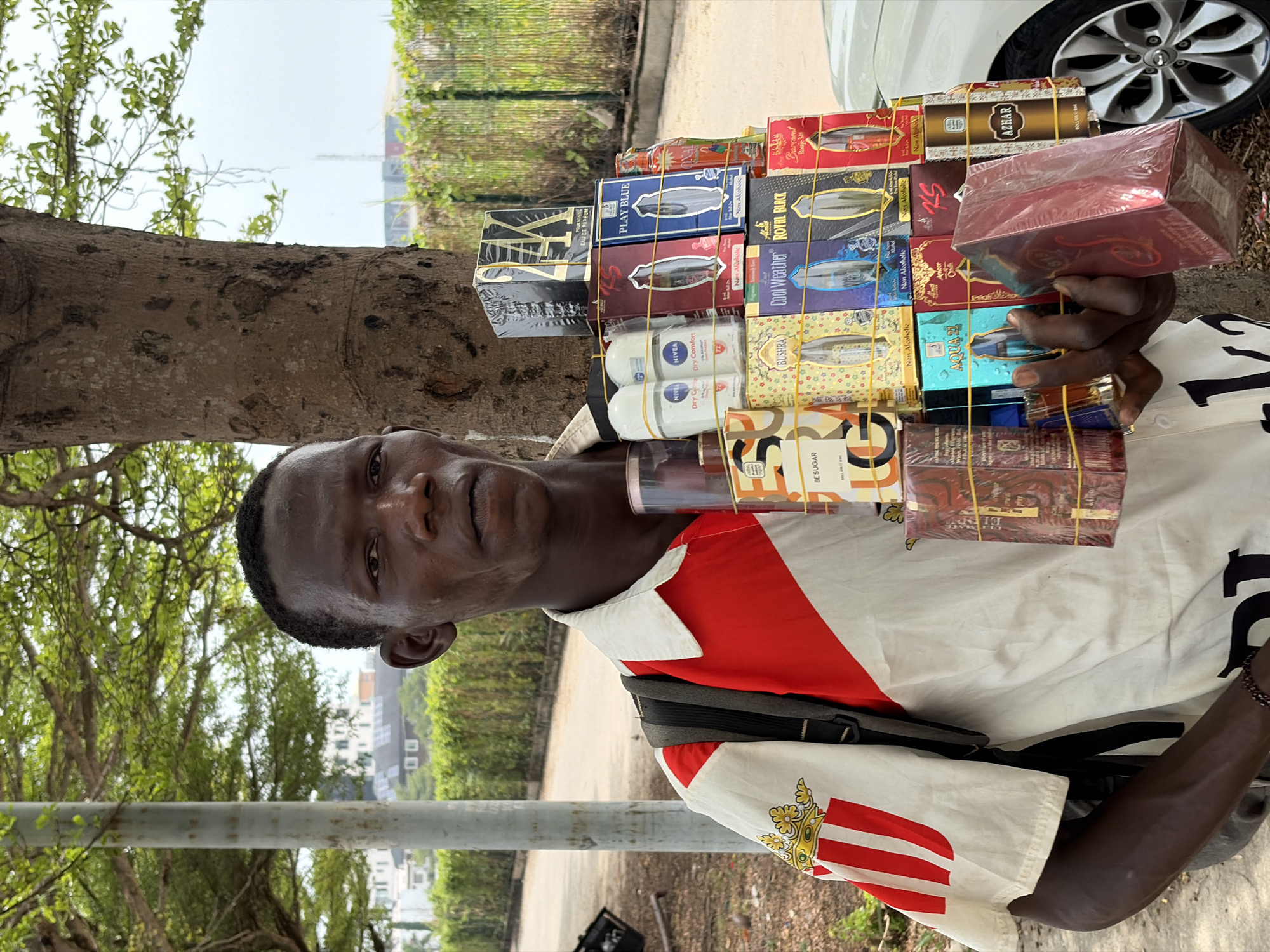 A street vendor in Igboefon, Nigeria, is standing and facing the camera, displaying a selection of perfumes stacked on his shoulders