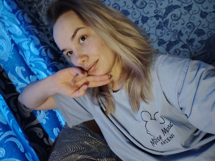 The scene is set indoors in the city of Elovo, Russia. It features a female individual with fair skin, light-colored hair with some lighter/purplish strands, and light brown eyes. She is depicted in a selfie pose, looking slightly upwards and to the right of the camera. Her right hand is positioned beneath her chin and jawline, with fingers lightly touching her lower lip. She is wearing a light blue long-sleeved t-shirt that displays a black outline graphic of Mickey Mouse's head accompanied by the text "Mickey Mose FRIEN!". To the left of the subject, blue curtains with a prominent white ornate pattern are visible. The background behind the individual consists of a wall or surface covered in dark blue wallpaper featuring a lighter blue swirling floral pattern. Below the subject, a segment of patterned fabric with a wavy or abstract design in light and dark tones is partially visible.