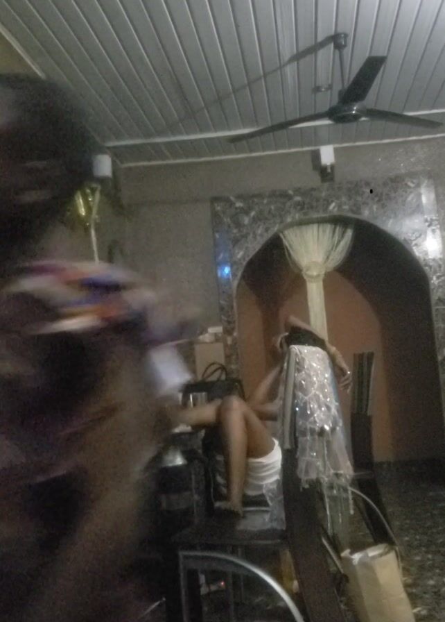 room with a slatted wall on the left. A ceiling fan is visible on the wall. In the center of the room, a person is sitting in a chair. The person appears to be wearing white shorts and is facing away from the camera. Behind the person is a wall with a decorative arch. Various objects are scattered around the room, including bags, boxes, and a container. There are also some objects wrapped in gold foil along the bottom of the slatted wall. The video appears to be shot from a slightly elevated perspective, and the camera is slightly tilted.