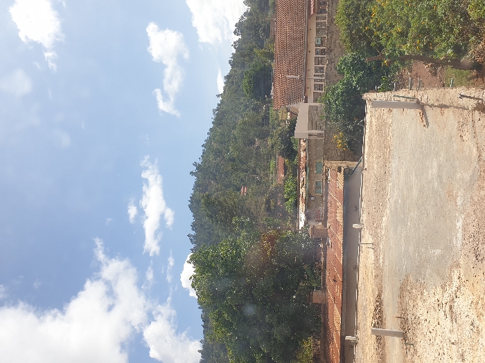 The image displays a daytime scene in Machakos, Kenya, under a blue sky with scattered white cumulus clouds. The immediate foreground consists of a relatively flat, unpaved area of light brown soil and gravel, interspersed with patches of rough concrete. Several short, cylindrical concrete posts are embedded vertically in this ground, suggesting ongoing construction or a prepared foundation. In the midground, a collection of buildings and dense vegetation is visible. To the left, a structure with a heavily rusted corrugated iron roof is partially obscured by a large green tree. To its right, a more substantial building with a red terracotta-tiled roof and a facade featuring multiple evenly spaced rectangular windows is prominent. Lush green trees and shrubs, some with yellow blossoms, grow around these structures and extend towards the background. The background is dominated by a large, verdant hill or mountain densely covered with trees. Several small, isolated structures with reddish roofs are discernible amidst the foliage on the hillside. No individuals are visible within the frame, and no specific actions or interactions are depicted.