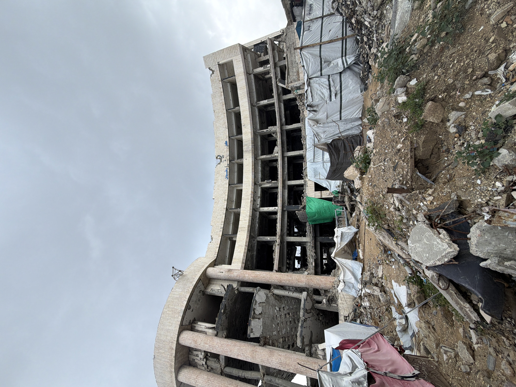 This image depicts a severely damaged, multi-story, curved building in Gaza, Palestinian Territory, under an overcast sky. The building exhibits extensive structural damage, including collapsed sections, exposed rebar, shattered concrete walls, and missing window apertures. Portions of the facade reveal a light-colored, possibly stone, cladding, with several large, round columns visible on the left side. Arabic script, including the word "رضوان," is visible on the upper part of the building's facade. In the foreground, a substantial amount of debris covers the ground, consisting of broken concrete, twisted metal, and soil. Amidst this rubble, several makeshift shelters constructed from white, green, black, and red/pink tarpaulins and fabric are visible. Sparse green vegetation grows out of the debris. No people are present in the scene.