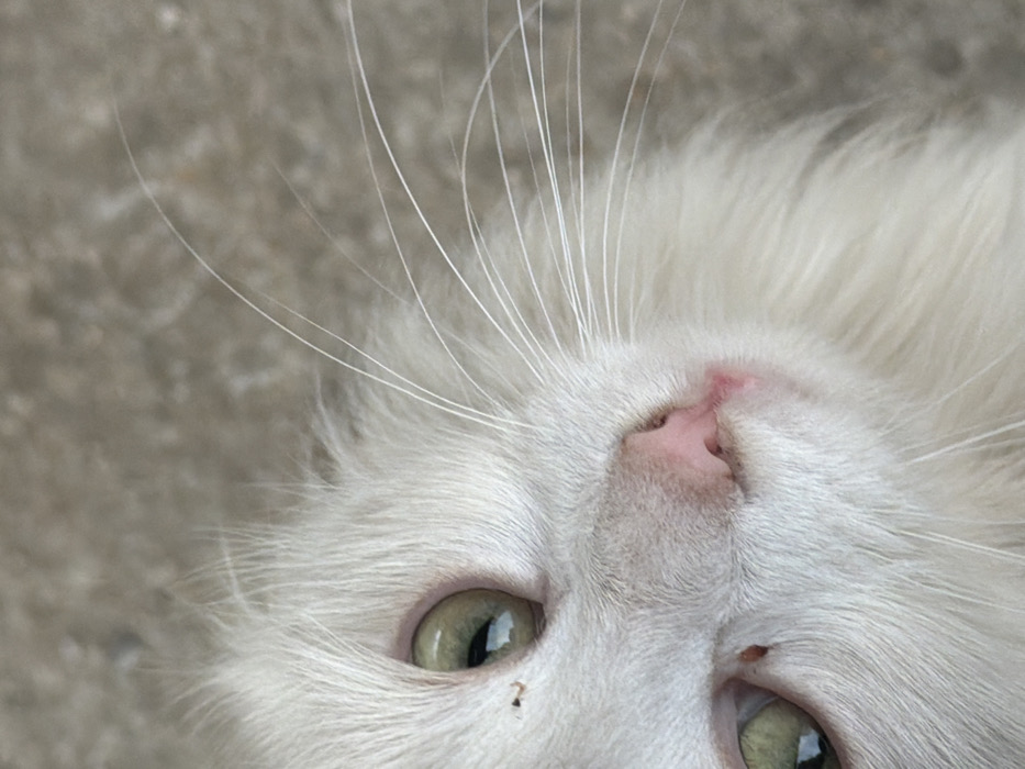 - "A close-up, eye-level forensic examination of the image reveals the head of a white domestic feline, likely a cat, positioned against a blurred, light grey background consistent with concrete or pavement, in the city of Razgrad, Bulgaria" by FM-W30e53, licensed under CC BY 4.0
