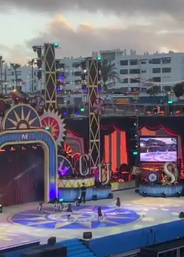 A wide shot captures a vibrant stage production set against a backdrop of urban buildings at dusk. The stage, decorated in bright, circus-themed colors, features a group of performers in the center. The audience, seated in rows, watches the performance. The sky overhead is overcast, with hints of sunset colors.