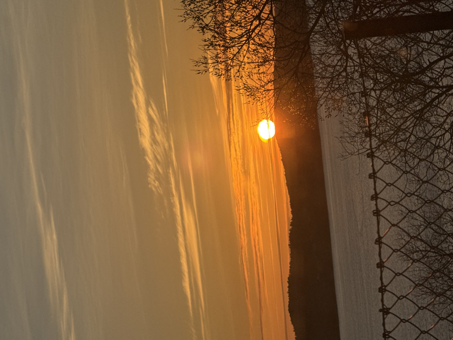 This image captures a sunset over a body of water, consistent with a view across one of Bergen's surrounding fjords or bays in Norway, looking generally westward. The scene is dominated by vibrant orange and yellow hues from the setting sun. In the foreground, a wire chain-link fence extends across the lower portion of the frame, partially obscured by the dark, silhouetted branches of bare deciduous trees. The fence appears metallic grey or dark due to backlighting. The midground features a calm body of water, likely a fjord, reflecting diffused light. Beyond the water, a dark, undulating range of hills or mountains, densely covered with trees, is silhouetted against the bright horizon. The outline of the distant land is visible against the sun's glow. The sun, a distinct yellow-orange disc, is positioned towards the right side of the frame, partially visible above and behind the silhouetted hills, casting a strong glare and lens flare. The sky above transitions from intense orange and yellow near the horizon, directly illuminated by the sun, to a paler orange-yellow and grey towards the top. Several elongated, horizontal wisps of cloud, possibly cirrus, are visible across the sky, catching the warm light. There are no discernible people, animals, or specific structures other than the fence and natural landscape elements present. The overall lighting suggests late afternoon or early evening.