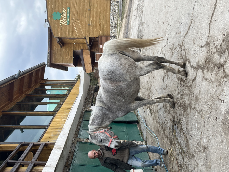 A dapple grey horse with a pink bridle and bell stands on a cracked concrete surface in Цигов чарк, Bulgaria. To the left, a male individual, appearing middle-aged to elderly with a bald head and stubble, wears a dark jacket, brown knitted sweater, blue jeans, and red gloves, holding a white bucket in his left hand. Two blue hoses are present on the ground near his feet. The background features two structures: a building on the left with green ground-level doors and a wooden upper floor with large rectangular windows, and to the right, a wooden building displaying a "Relax Guest House" sign with a green four-leaf clover logo. The sky is overcast.