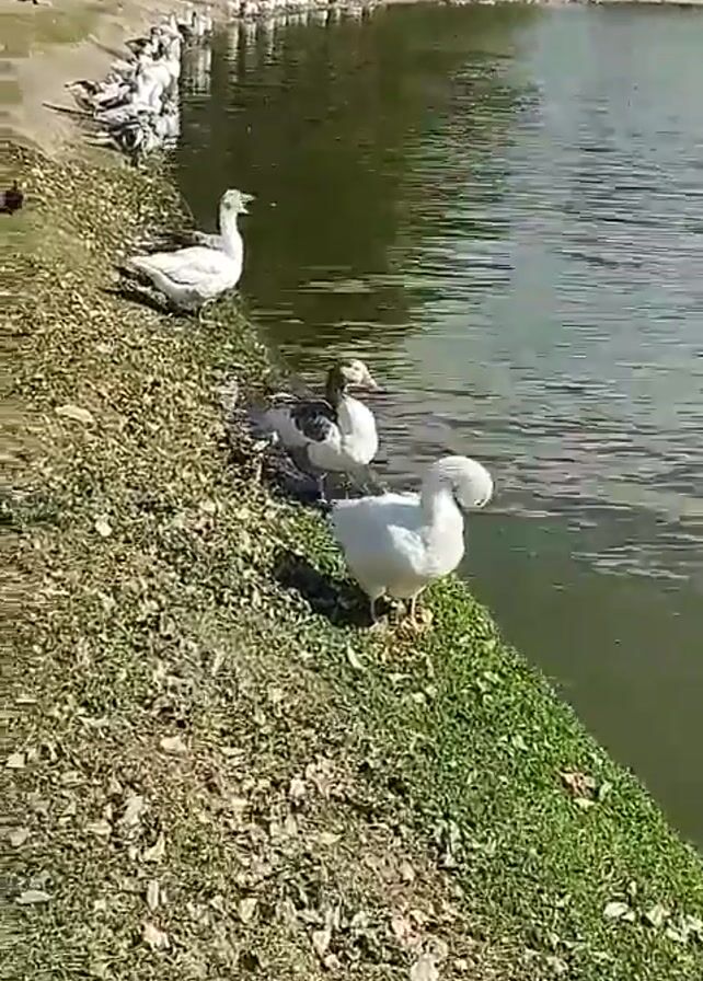 picturesque scene of a lake in a park on a sunny day. A line of white and gray geese are gathered along the edge of the lake, resting on the grassy bank. A few geese are closer to the camera, foraging in the grass. In the background, there are people walking along a path, and tall trees line the perimeter of the park. The water in the lake is calm, reflecting the sky. A single pigeon stands apart from the geese. Overall, the video captures a peaceful moment in nature.