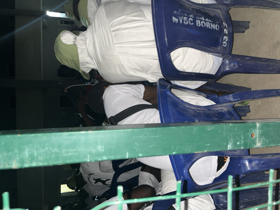 A group of people is seated on blue plastic chairs labeled "NYSC BORNO." Most individuals are wearing white shirts, likely part of a uniform. One person has a green hat. A green metal railing is in the foreground, partially obscuring the view. The scene appears to be crowded and possibly indoors, based on the dim lighting and visible walls in the background. The chairs are arranged in rows, suggesting an organized gathering.