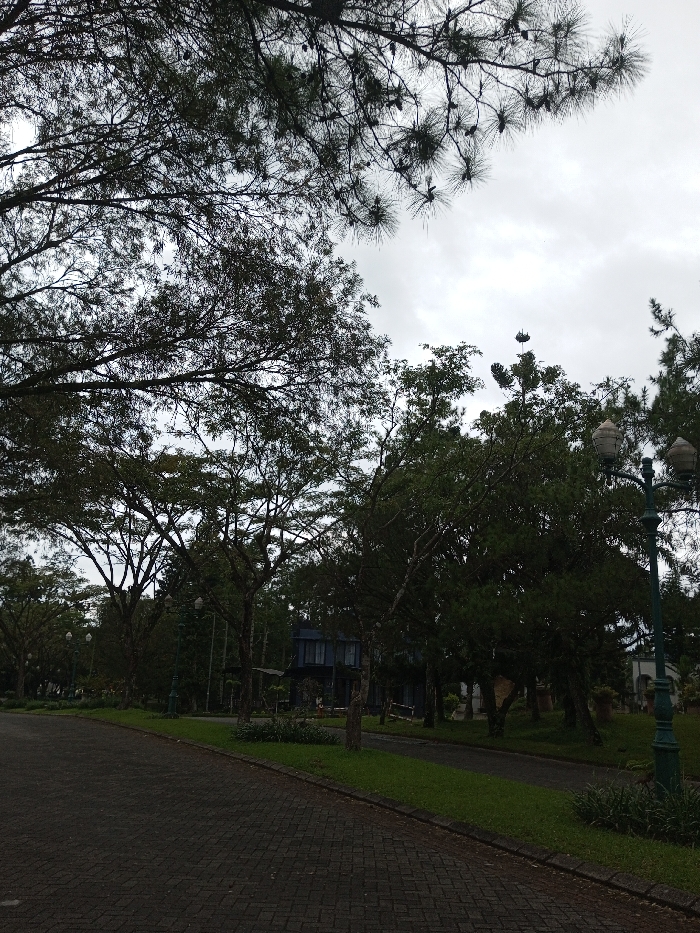 A park scene unfolds with a paved path cutting through lush greenery. Tall trees with dense foliage dominate the landscape, their branches reaching up to a cloudy sky. Decorative lampposts line the path, adding a touch of elegance. A building is nestled amidst the trees in the background. The overall mood is serene and shaded.